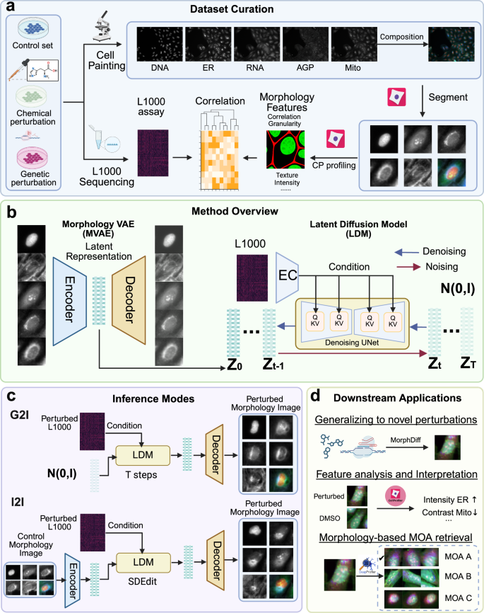 Investigating cell morphology changes after perturbations using high-throughput image-based profiling is increasingly important for phenotypic drug discovery, including predicting mechanisms of action (MOA) and compound bioactivity. The vast space of chemical and genetic perturbations makes it impractical to explore all possibilities using conventional methods. Here we propose MorphDiff, a transcriptome-guided latent diffusion model that simulates high-fidelity cell morphological responses to perturbations. We demonstrate MorphDiff’s effectiveness on three large-scale datasets, including two drug perturbation and one genetic perturbation dataset, covering thousands of perturbations. Extensive benchmarking shows MorphDiff accurately predicts cell morphological changes under unseen perturbations. Additionally, MorphDiff enhances MOA retrieval, achieving an accuracy comparable to ground-truth morphology and outperforming baseline methods by 16.9% and 8.0%, respectively. This work highlights MorphDiff’s potential to accelerate phenotypic screening and improve MOA identification, making it a powerful tool in drug discovery.