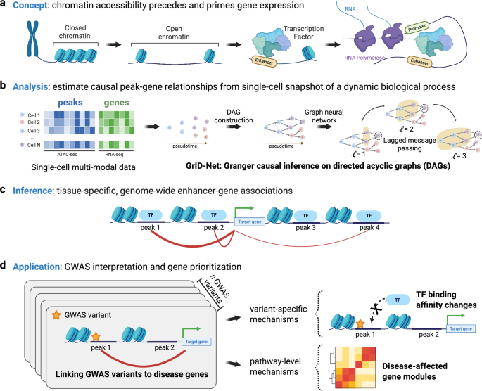 Genome-wide association studies (GWAS) identify numerous disease-linked genetic variants at noncoding genomic loci, yet therapeutic progress is hampered by the challenge of deciphering the regulatory roles of these loci in tissue-specific contexts. Single-cell multimodal assays that simultaneously profile chromatin accessibility and gene expression could predict tissue-specific causal links between noncoding loci and the genes they affect. However, current computational strategies either neglect the causal relationship between chromatin accessibility and transcription or lack variant-level precision, aggregating data across genomic ranges due to data sparsity. To address this, we introduce GrID-Net, a graph neural network approach that generalizes Granger causal inference to detect new causal locus–gene associations in graph-structured systems such as single-cell trajectories. Inspired by the principles of optical parallax, which reveals object depth from static snapshots, we hypothesize that causal mechanisms could be inferred from static single-cell snapshots by exploiting the time lag between epigenetic and transcriptional cell states, a concept we term “cell-state parallax.” Applying GrID-Net to schizophrenia (SCZ) genetic variants, we increase variant coverage by 36% and uncovered noncoding mechanisms that dysregulate 132 genes, including key potassium transporters such as KCNG2 and SLC12A6. Furthermore, we discover evidence for the prominent role of neural transcription-factor binding disruptions in SCZ etiology. Our work not only provides a strategy for elucidating the tissue-specific impact of noncoding variants but also underscores the breakthrough potential of cell-state parallax in single-cell multiomics for discovering tissue-specific gene regulatory mechanisms.